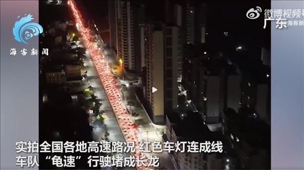 也有有網(wǎng)友曬出高速路況畫面,車隊(duì)“龜速”行駛堵成長龍,并表示“特意提前三天回去。