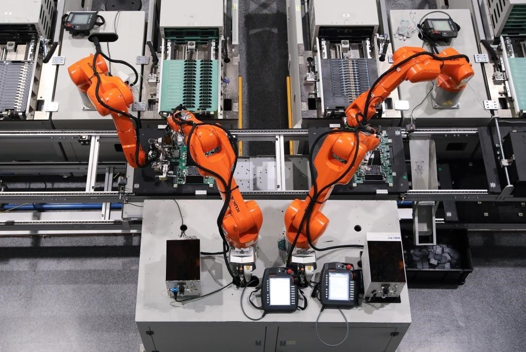 5月22日,在杭州紫光恒越(杭州)技術有限公司“未來工廠”,機械臂在工作中。新華社記者 杜瀟逸 攝