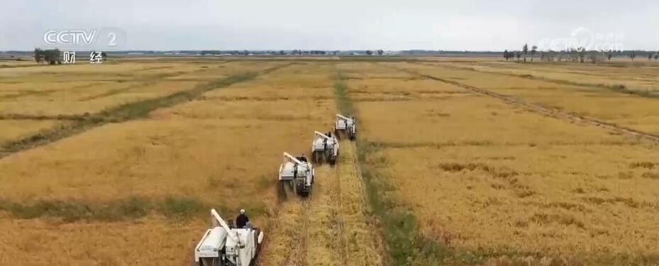 在農(nóng)安縣開安鎮(zhèn)的稻田里,幾臺(tái)大型收割機(jī)編組作業(yè),往來(lái)穿梭在稻田里收割稻谷。