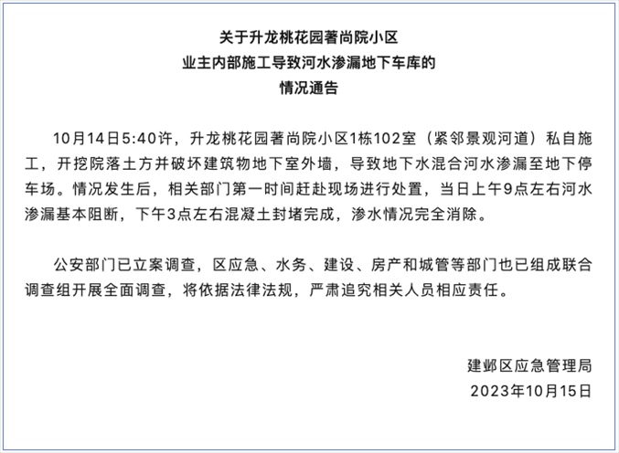 ·網(wǎng)傳南京一業(yè)主濫挖地下室致河水倒灌車庫,官方通報(bào):多部門調(diào)查追責(zé)。