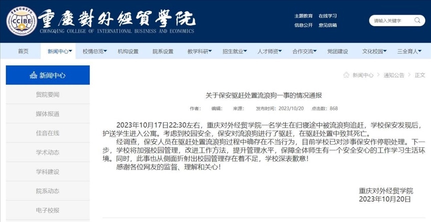 ·重慶對外經(jīng)貿學院通報“流浪狗被保安驅趕處置致死”:涉事保安停職。