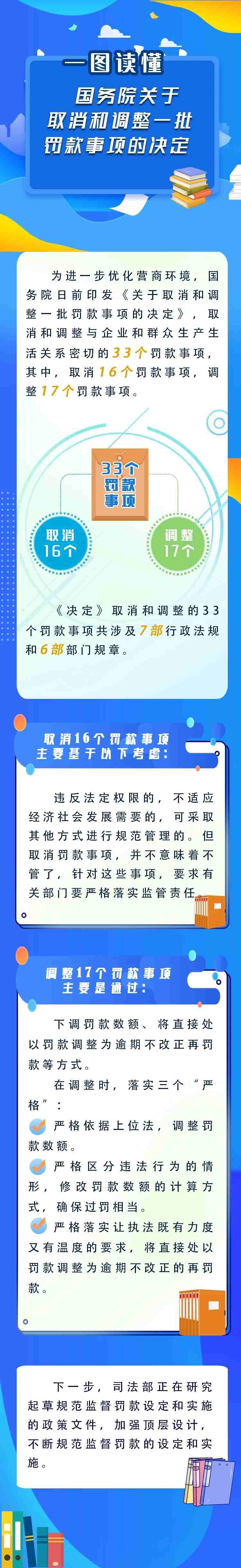國務(wù)院日前印發(fā)《關(guān)于取消和調(diào)整一批罰款事項的決定》(以下簡稱《決定》),取消調(diào)整與企業(yè)和群眾生產(chǎn)生活關(guān)系密切的33個罰款事項。