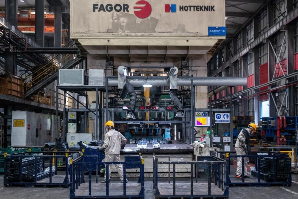 在位于重慶市兩江新區(qū)的一家機(jī)械設(shè)備生產(chǎn)企業(yè)的熱壓車間,工人將剛下線的零件裝箱(2023年7月16日攝)。新華社記者儲加音攝