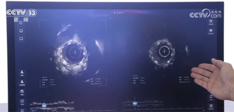 總臺(tái)央視記者 褚爾嘉:這里是一個(gè)傳統(tǒng)的血管的超聲圖像,我們可以看到血管的全貌。右邊這里是一個(gè)工作頻率高達(dá)100兆赫茲的超高頻的血管內(nèi)超聲圖像,通過(guò)技術(shù)升級(jí),現(xiàn)在我們可以更加清晰地看到冠狀動(dòng)脈的精細(xì)結(jié)構(gòu),這也是目前世界上清晰度最高的一個(gè)血管內(nèi)的超聲圖像。