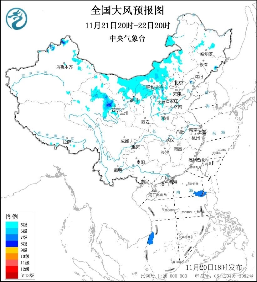 11月21日20時至22日20時,新疆北部、內(nèi)蒙古大部、甘肅西北部、青海北部、寧夏北部、陜西北部、山西大部、河北西部、黑龍江西部、吉林東部等地部分地區(qū)將有5~6級、陣風(fēng)7~8級的大風(fēng);巴士海峽、南海中東部和西南部海域?qū)⒂?~8級、陣風(fēng)9級的大風(fēng)。