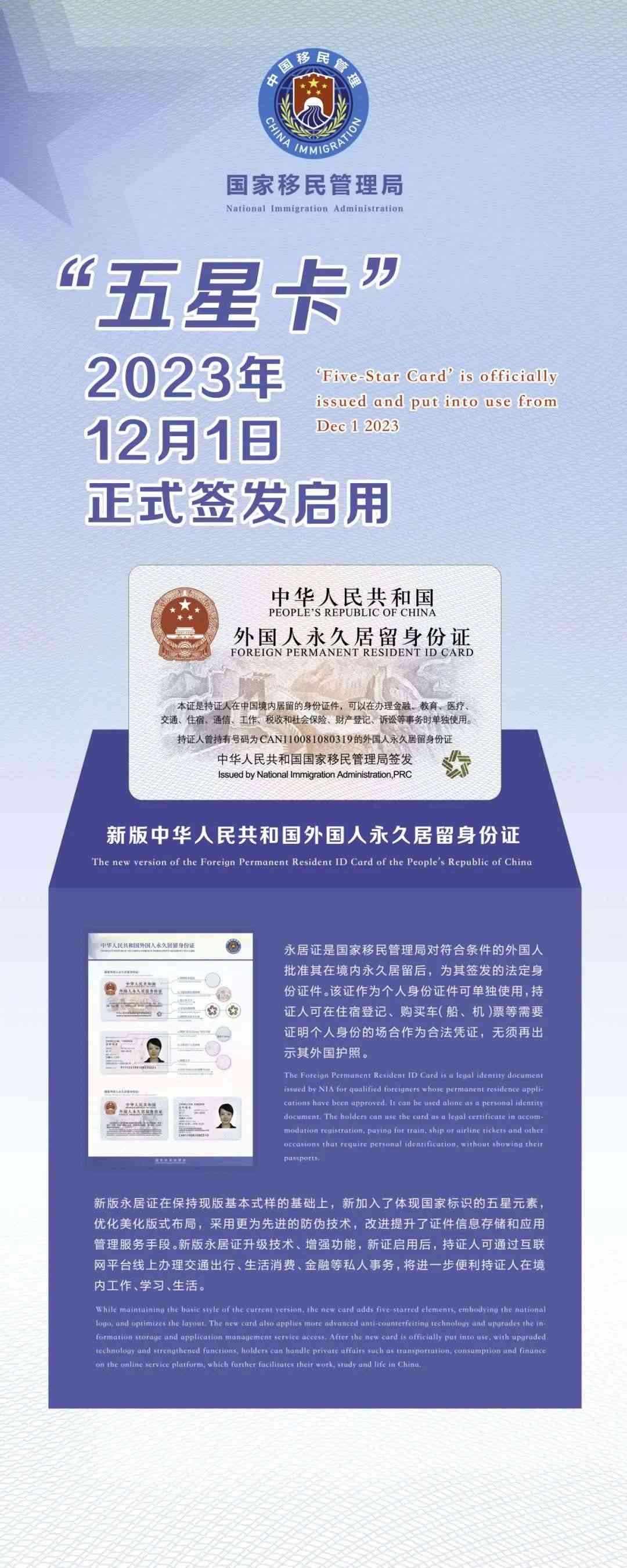 央視網(wǎng)消息:據(jù)國家移民管理局,新版中華人民共和國外國人永久居留身份證12月1日正式簽發(fā)啟用。因加入了體現(xiàn)國家標(biāo)識(shí)的五星元素,新版永居證被稱為“五星卡”。首日共有50名取得在華永久居留資格的外國人領(lǐng)取到了首批“五星卡”。他們來自美國、德國、英國、法國、俄羅斯、瑞典、新加坡、韓國等二十余個(gè)國家,均為在經(jīng)濟(jì)、教育、科技、文化、衛(wèi)生等多個(gè)領(lǐng)域?yàn)橹袊?jīng)濟(jì)社會(huì)發(fā)展做出了突出貢獻(xiàn)人員,當(dāng)中包括中國政府友誼獎(jiǎng)獲得者,在華長期任職工作的外籍高層次管理和專業(yè)技術(shù)人員,在重點(diǎn)院校、科研機(jī)構(gòu)長期從事教學(xué)科研的外籍教授學(xué)者等。當(dāng)天,在北京、天津、上海、廣東等地公安機(jī)關(guān)出入境辦證窗口,還有不少永久居留外國人前來咨詢申請(qǐng)換發(fā)“五星卡”。