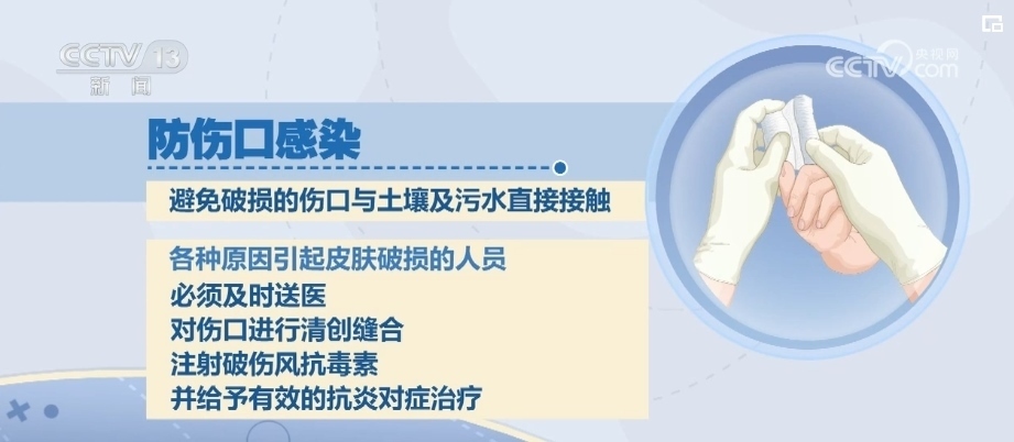 如果有受傷的情況,應避免破損的傷口與土壤及污水直接接觸。各種原因引起皮膚破損的人員必須及時送醫(yī),對傷口進行清創(chuàng)縫合、注射破傷風抗毒素,并給予有效的抗炎對癥治療。