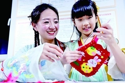 浙江省杭州市上城區(qū)丁蘭街道五會(huì)港社區(qū),社區(qū)工作者和小朋友一起制作中秋福袋。周方玲攝/光明圖片