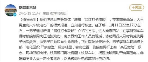 ·南京站回應“大學生爬火車打卡被燒傷進ICU”:男子無生命危險,接觸網均有高壓電非專業(yè)人員不要靠近。
