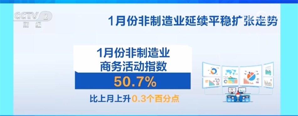 此外,1月份非制造業(yè)商務(wù)活動(dòng)指數(shù)為50.7%,比上月上升0.3個(gè)百分點(diǎn),延續(xù)平穩(wěn)擴(kuò)張走勢(shì)。其中,服務(wù)業(yè)商務(wù)活動(dòng)指數(shù)升至擴(kuò)張區(qū)間,景氣面也有所擴(kuò)大。在節(jié)日效應(yīng)帶動(dòng)下,零售、道路運(yùn)輸、餐飲等行業(yè)商務(wù)活動(dòng)指數(shù)升至擴(kuò)張區(qū)間。郵政、貨幣金融服務(wù)等行業(yè)業(yè)務(wù)量增長較快。