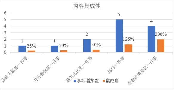 從內(nèi)容集成度看,5項(xiàng)相關(guān)“一件事”的事項(xiàng)集成比例均有不同程度提升。“殘疾人服務(wù)一件事”增加1個事項(xiàng),集成度提升25%。“開辦餐飲店一件事”增加1個事項(xiàng),集成度提升33%。“新生兒出生一件事”增加2個事項(xiàng),集成度提升40%?!巴诵菀患隆痹黾?個事項(xiàng),集成度提升125%?!捌髽I(yè)注銷登記一件事”增加4個事項(xiàng),集成度提升200%。