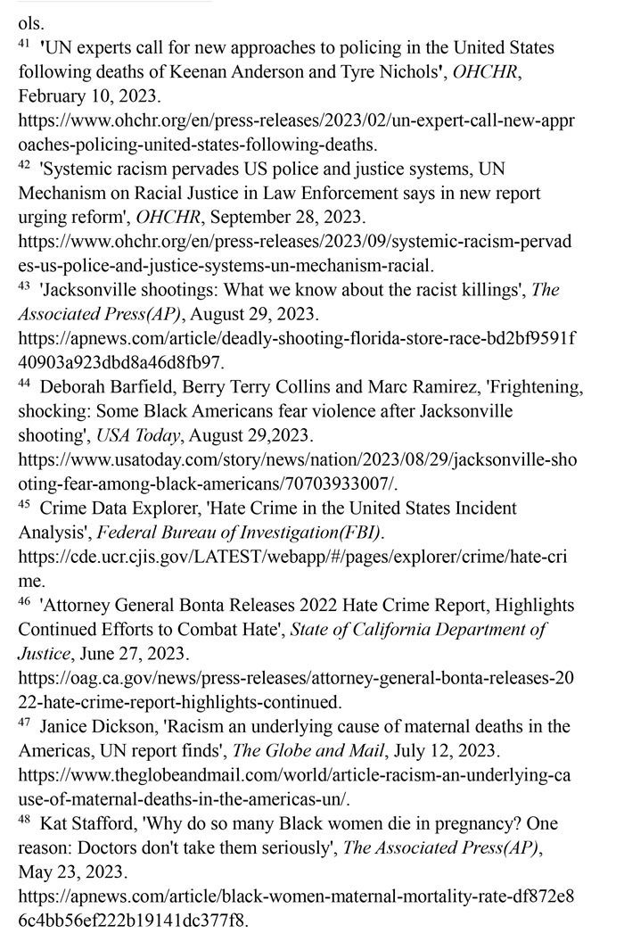 非洲裔在執(zhí)法領(lǐng)域面臨嚴(yán)重種族歧視。2023年1月3日,洛杉磯31歲的非洲裔男子基南·安德森涉嫌交通肇事,警方在制服他的過程中使用電擊槍擊中其6次,致其心臟病發(fā),送醫(yī)不治身亡。(注39)2023年1月7日,田納西州孟菲斯市的警察以“魯莽駕駛”為由將29歲的非洲裔男子泰爾·尼科爾斯攔下,并對其進(jìn)行長達(dá)數(shù)分鐘的殘忍毆打。三天后尼科爾斯因傷勢過重去世,而事后的調(diào)查無法證實警察關(guān)于其“魯莽駕駛”的說法。(注40)這兩起非洲裔遭受警察暴力執(zhí)法身亡案例引發(fā)多名聯(lián)合國專家的高度關(guān)注。專家們強調(diào),在兩起事件中,警察使用的武力違反保護(hù)生命權(quán),禁止酷刑和其他殘忍、不人道或有辱人格待遇或處罰的國際準(zhǔn)則,也不符合聯(lián)合國《執(zhí)法人員行為守則》和《執(zhí)法人員使用武力和火器的基本原則》。(注41)聯(lián)合國人權(quán)理事會在執(zhí)法工作中推進(jìn)種族正義和平等的國際獨立專家機制在對美國實地訪問后發(fā)布報告指出,針對非洲裔的系統(tǒng)性種族主義已經(jīng)滲透到美國警察隊伍和刑事司法系統(tǒng)。非洲裔被警察殺害的可能性是白人的3倍,被監(jiān)禁的可能性是白人的4.5倍。在每年1000多起警察殺人案件中,只有1%的涉事警察被指控。報告警告說,美國如果不按照國際標(biāo)準(zhǔn)改革警察使用武力的規(guī)則,許多殺戮將繼續(xù)發(fā)生。(注42)