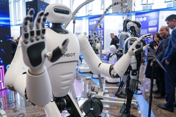 2025年2月14日在2025年蘇州市“人工智能+”創(chuàng)新發(fā)展推進(jìn)大會(huì)暨人工智能賦能新型工業(yè)化深度行(蘇州站)活動(dòng)現(xiàn)場(chǎng)拍攝的人形機(jī)器人。新華社記者 李博 攝