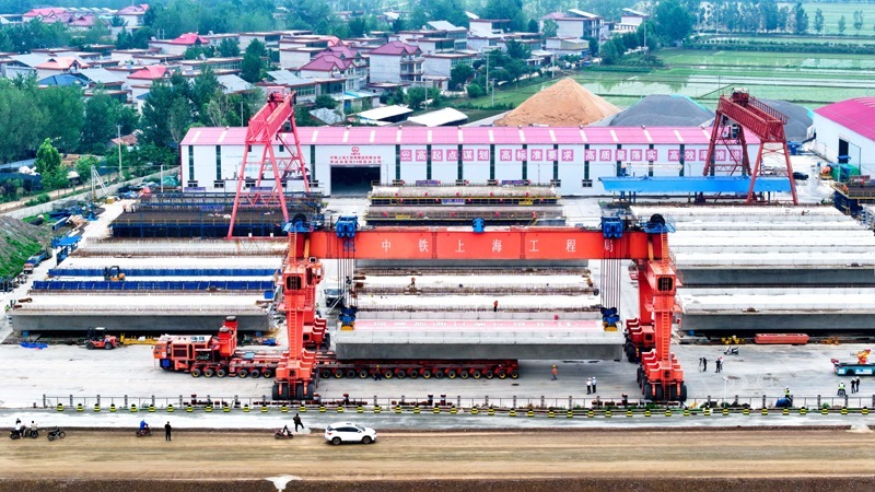 6月21日,在濰宿高鐵中鐵上海局郯城制梁場,提梁機(jī)在提運(yùn)箱梁(無人機(jī)照片)。