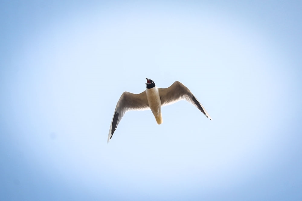 在盤錦市遼河口國家級(jí)自然保護(hù)區(qū)南小河保護(hù)站附近的濕地,黑嘴鷗在天空中飛翔(2022年6月17日攝)。新華社記者 潘昱龍 攝