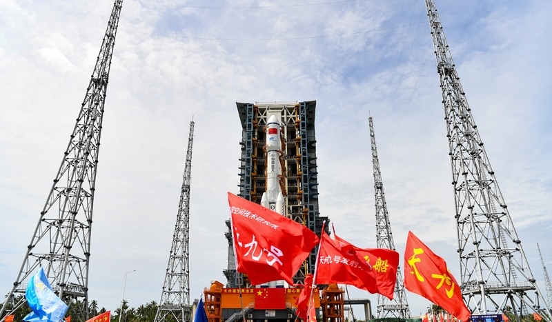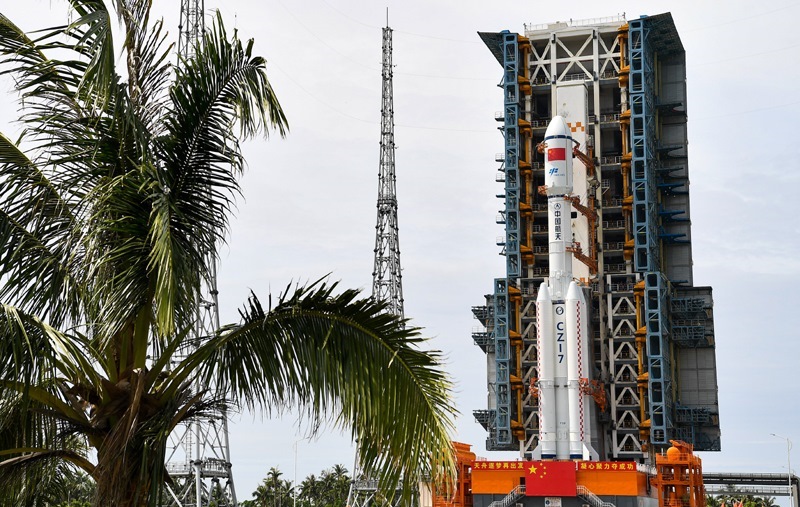 7月12日,天舟九號貨運飛船與長征七號遙十運載火箭組合體垂直轉(zhuǎn)運中。