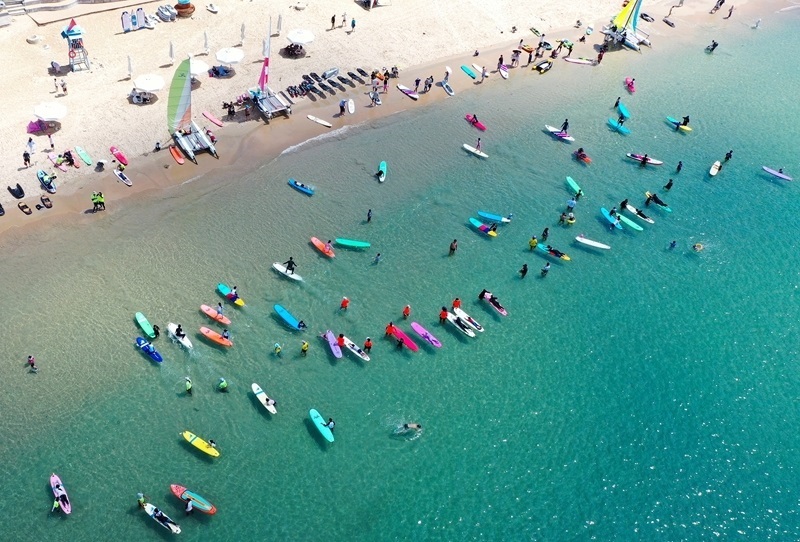 8月10日,游客在三亞市后海村附近海域沖浪嬉水(無(wú)人機(jī)照片)。