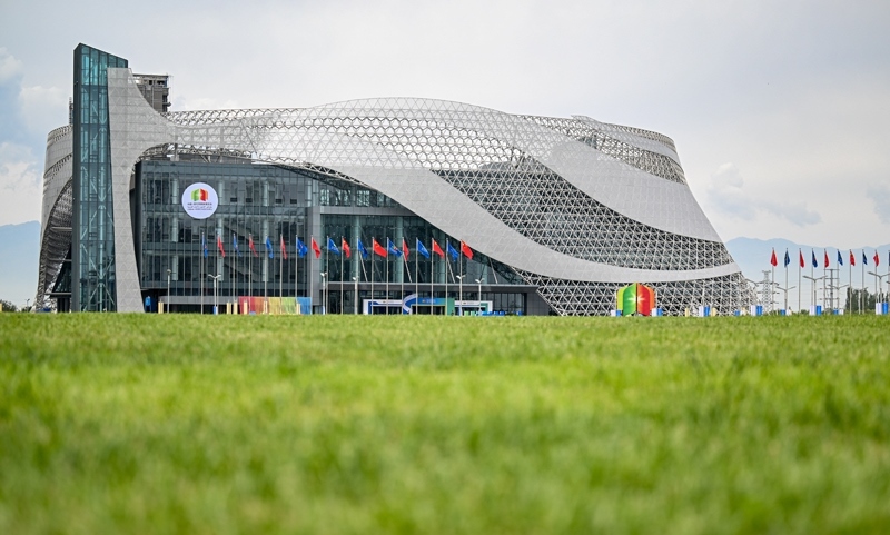 這是8月28日在寧夏銀川市拍攝的第七屆中國(guó)—阿拉伯國(guó)家博覽會(huì)開(kāi)幕式會(huì)場(chǎng)外景。