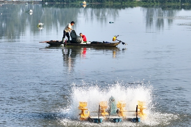 10月4日,蟹農(nóng)在江蘇省寶應(yīng)縣夏集鎮(zhèn)王營村養(yǎng)殖基地捕撈螃蟹(無人機照片)。