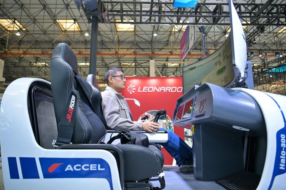 10月14日,工作人員在天津直博會直升機館內調試模擬飛行體驗設備。新華社記者 孫凡越 攝