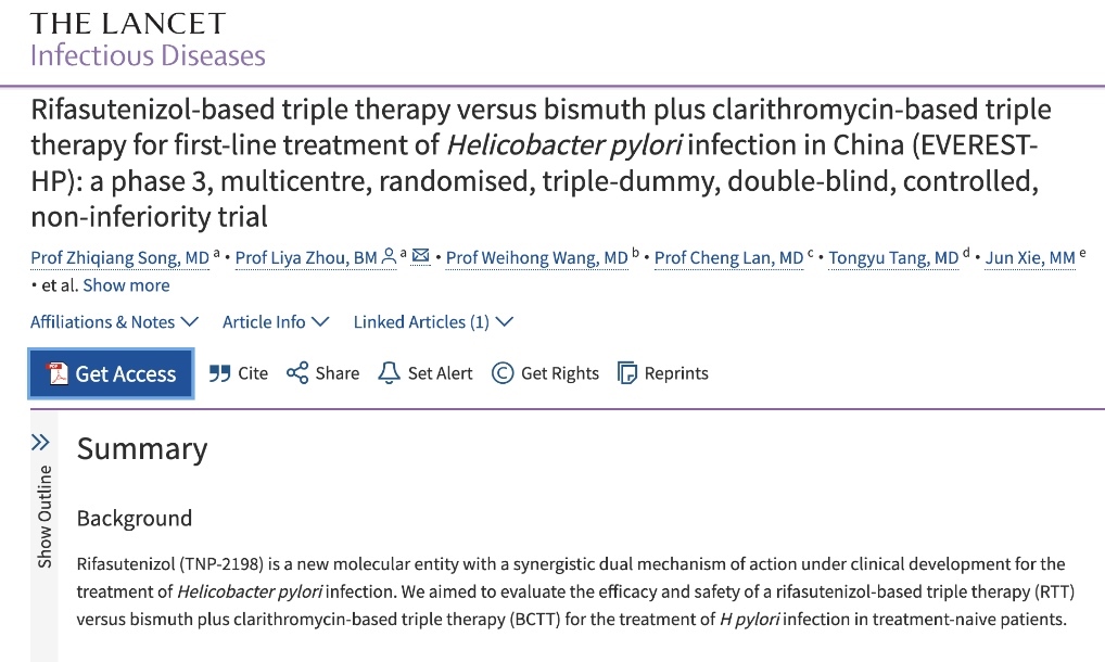 北京大學(xué)第三醫(yī)院消化科周麗雅、宋志強教授團隊帶領(lǐng)全國40家醫(yī)療機構(gòu)消化疾病診療中心,通過全球首個Ⅲ期臨床試驗,證實了含利福特尼唑的三聯(lián)方案,比臨床上常用的鉍劑四聯(lián)方案具有更高的根除成功率和更低的不良反應(yīng)發(fā)生率,而且用藥更少,服用更方便,將為全球幽門螺桿菌感染者帶來了全新的治療選擇。相關(guān)成果日前于《柳葉刀-感染病學(xué)》在線發(fā)表。
