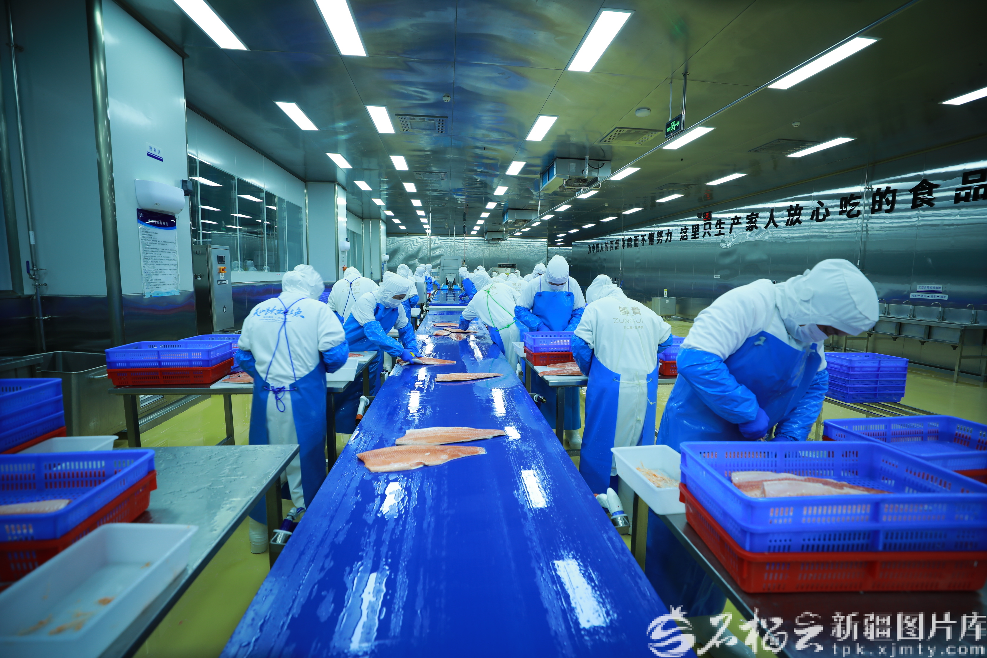 新疆天蘊有機農(nóng)業(yè)有限公司三文魚深加工廠,工人在加工三文魚。趙學(xué)林攝(資料圖)