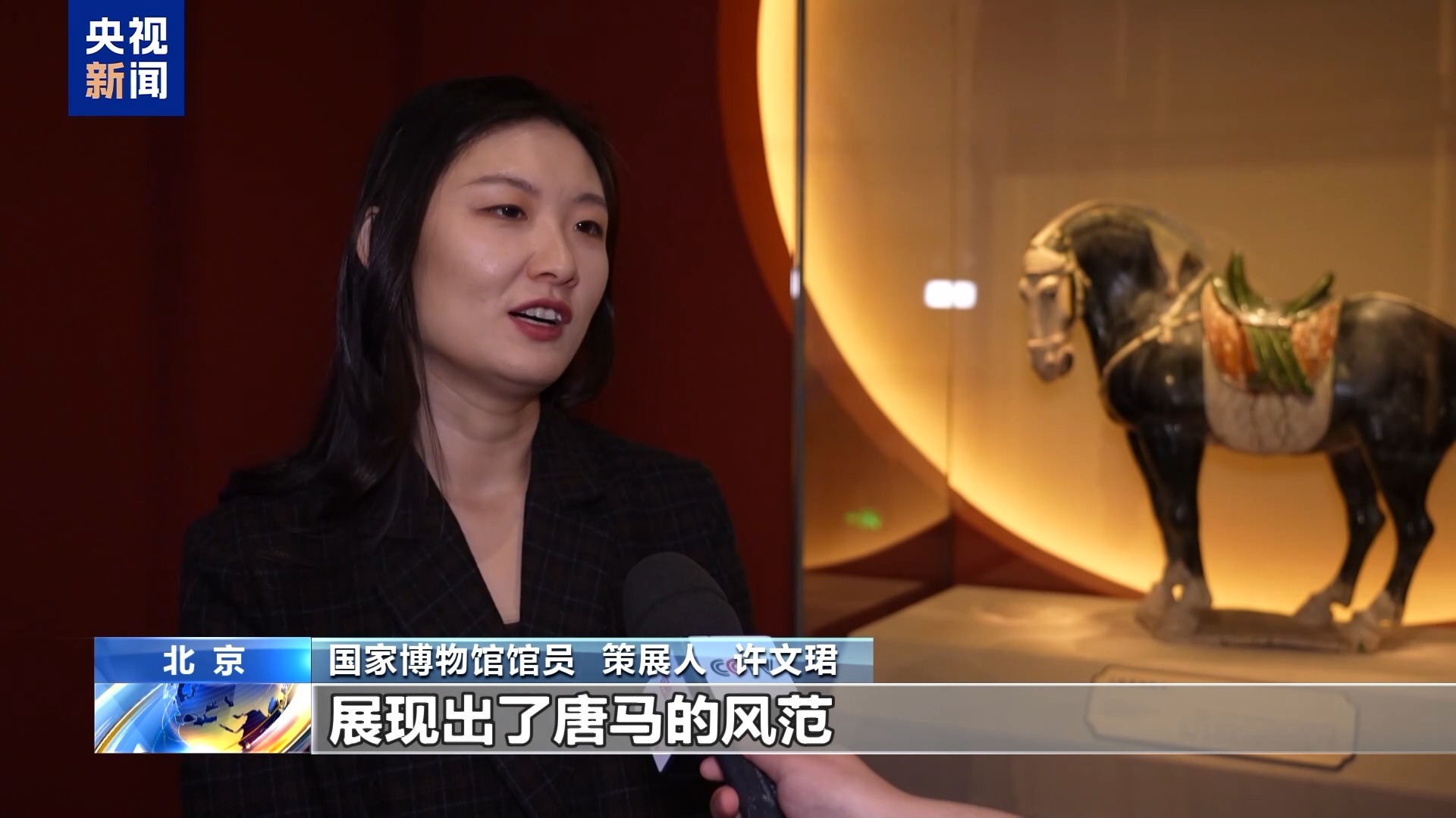 國家博物館館員、策展人 許文珺:它一改漢代時期古拙平穩(wěn)的風(fēng)格,展現(xiàn)出了唐馬的風(fēng)范。它是唐三彩中難得的一件黑釉精品,也是我們國博的鎮(zhèn)館之寶之一。
