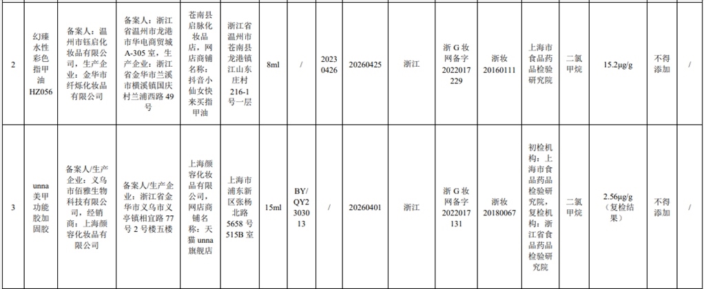 根據(jù)通告,在2023年國(guó)家化妝品抽樣檢驗(yàn)工作中,經(jīng)上海市食品藥品檢驗(yàn)研究院等單位檢驗(yàn),產(chǎn)品標(biāo)簽標(biāo)示委托方為溫州市鈺啟化妝品有限公司、受托生產(chǎn)企業(yè)為金華市纖爍化妝品有限公司生產(chǎn)的幻臻水性彩色指甲油HZ088等7批次化妝品不符合規(guī)定,檢出《化妝品安全技術(shù)規(guī)范(2015年版)》中規(guī)定的禁用原料。