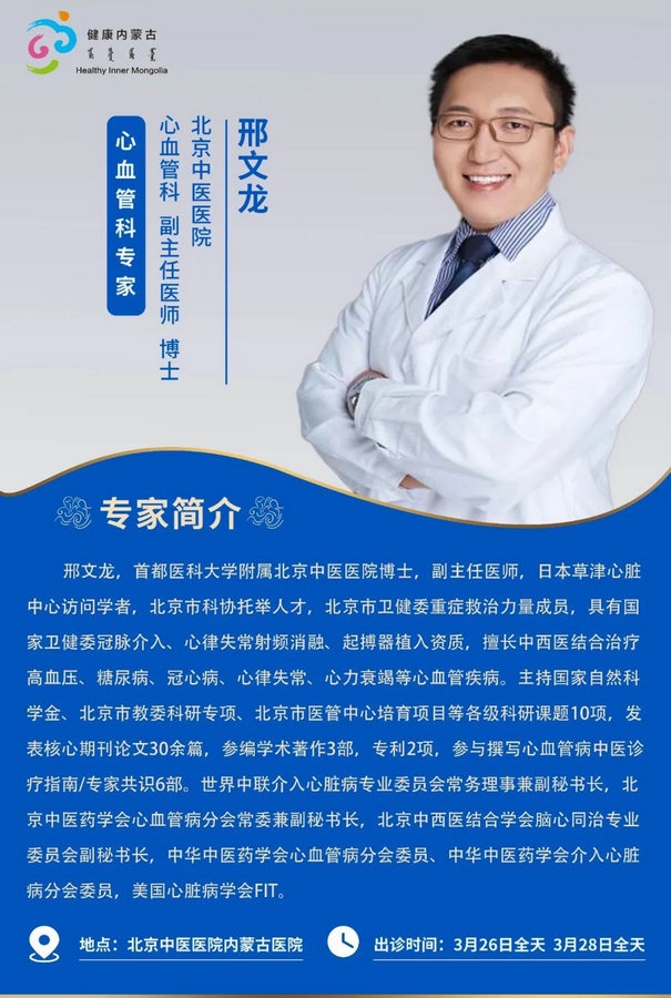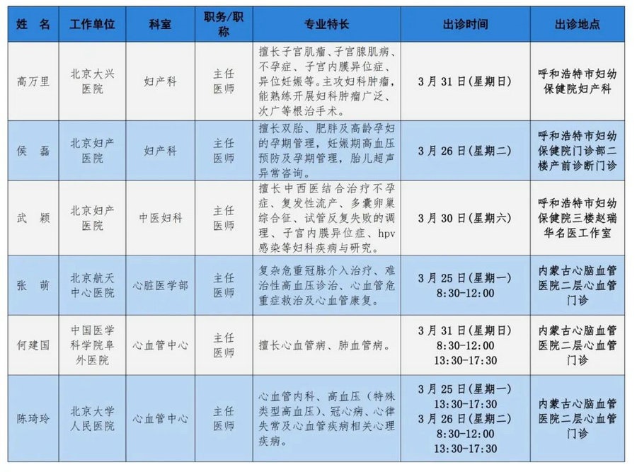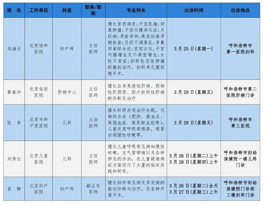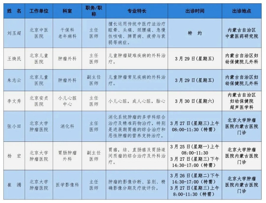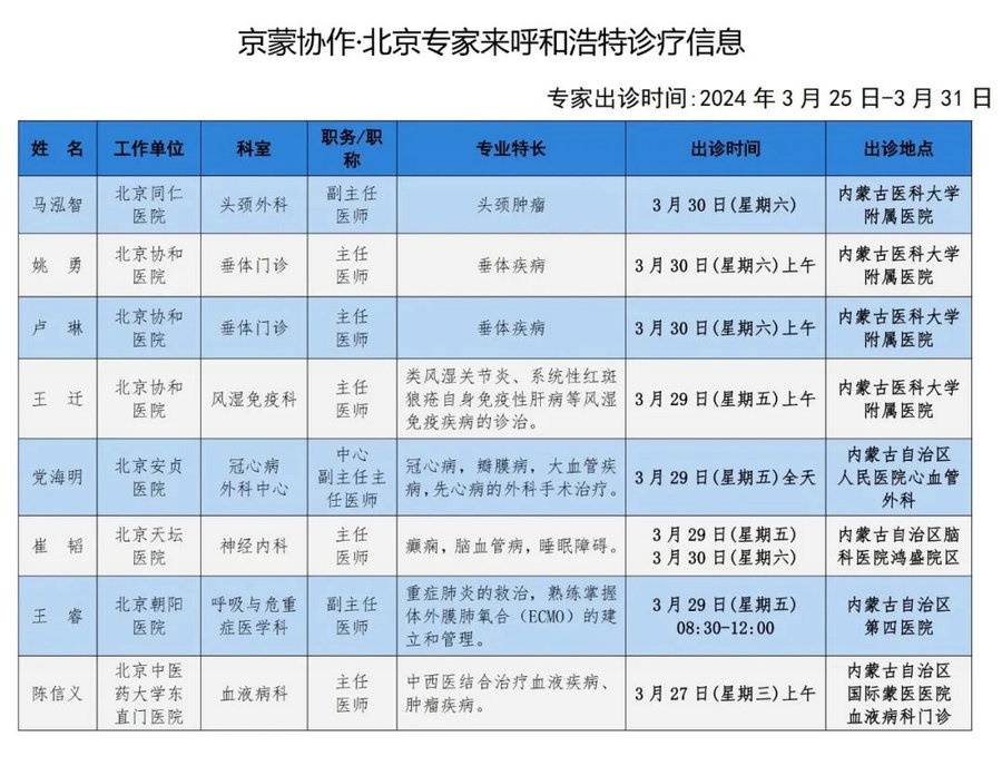 京蒙協(xié)作 政協(xié)助力。每周有北京相關(guān)協(xié)作醫(yī)院專(zhuān)家來(lái)呼和浩特出診,現(xiàn)將本周專(zhuān)家出診信息予以發(fā)布。