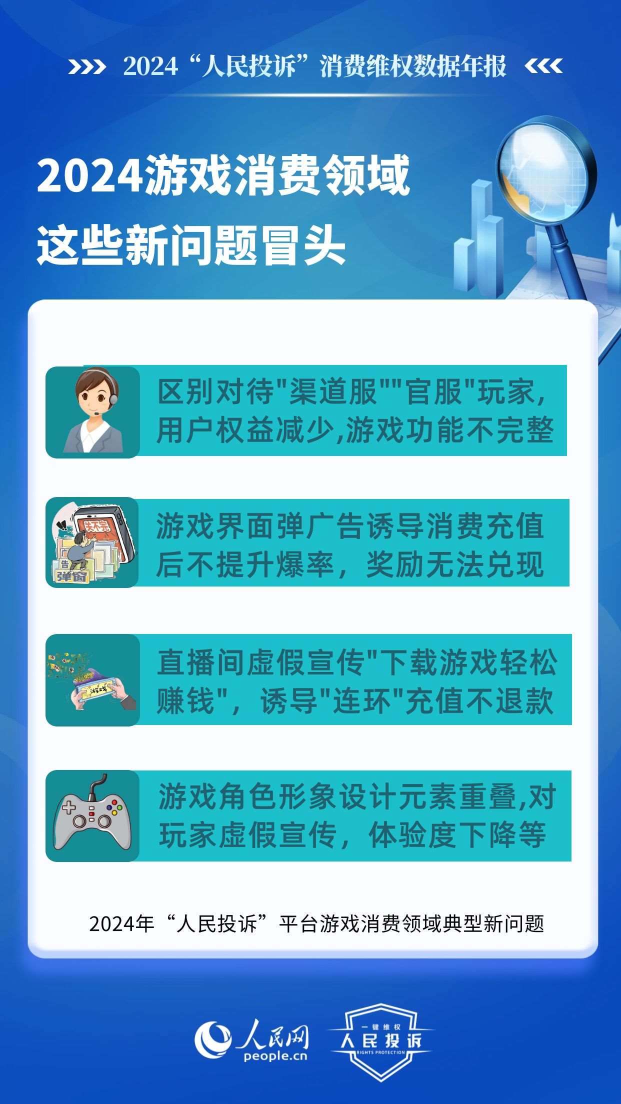 在游戲類,老問題主要有:未成年人網(wǎng)游消費不規(guī)范,平臺以“免費”“紅包”誘導(dǎo)點擊充值,未身份驗證、支付環(huán)節(jié)無提示,提交證據(jù)申請退款遭拒或退款金額不合理;虛假宣傳游戲內(nèi)容誘導(dǎo)充值點券,玩家實際回報/游戲體驗與預(yù)期不符;無故封號、游戲裝備丟失、賬號被盜、系統(tǒng)漏洞導(dǎo)致玩家利益受損,客服不回應(yīng)、平臺不理;系統(tǒng)漏洞、卡頓閃退、匹配機制失衡等網(wǎng)游體驗差等。