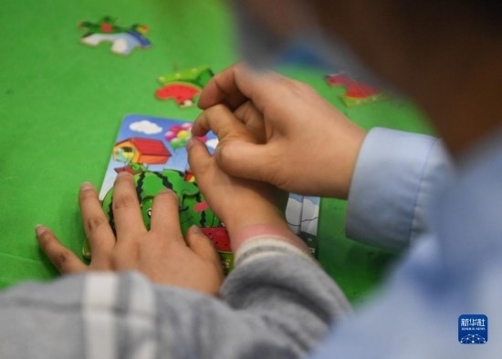 3月30日,在西安市金色陽光康復中心,特教老師指導孩子練習拼圖。