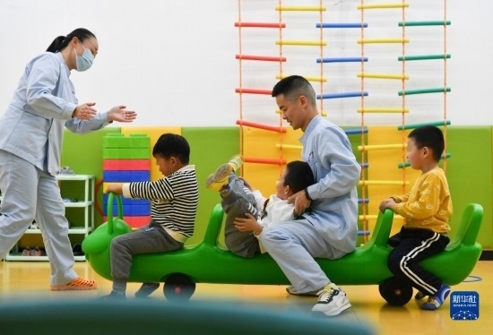 3月30日,在西安市金色陽光康復中心,兩位特教老師(左一、右二)與孩子們一起游戲。