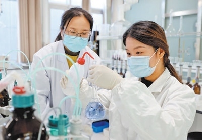 山東省棗莊市西王莊鎮(zhèn)一個實驗室內(nèi),碩士研究生晁齊齊(右)在做化學實驗。孫中喆攝(人民視覺)