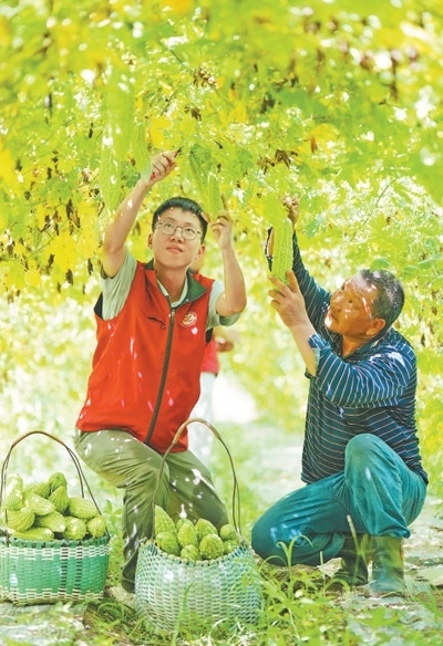廣西壯族自治區(qū)靈川縣靈田鎮(zhèn)東田村,來自山東大學的博士研究生羅雯耀(左)在幫村民采摘。黃勇丹攝(人民視覺)