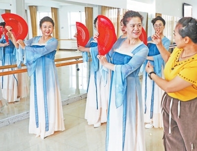 內(nèi)蒙古自治區(qū)呼倫貝爾市扎蘭屯市老年活動中心,幾名學員在老年大學上舞蹈課。韓穎群攝(影像中國)