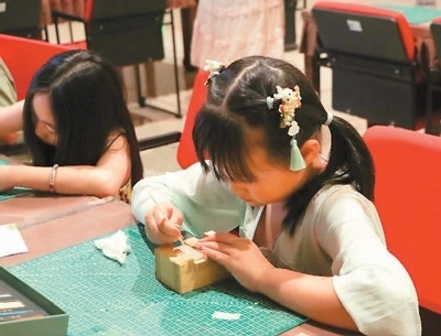 在四層的非遺手工藝體驗(yàn)中心,許多小朋友正在興致勃勃地體驗(yàn)古法制玉、敦煌石粉彩繪技藝(壁畫臨?。⒓埞{加工技藝(流沙箋團(tuán)扇制作)等非遺項(xiàng)目。一位小朋友正在美美地擺弄著自己親手制作的流沙箋團(tuán)扇。她的母親許女士介紹說,這些項(xiàng)目雖然看著傳統(tǒng)但其實(shí)非常時尚,孩子很喜歡這些手工項(xiàng)目,覺得很有趣;帶孩子在博物館里看展覽還能做手工,是一項(xiàng)很有意義的體驗(yàn)。