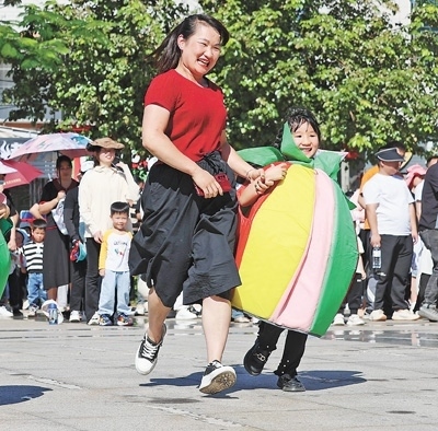 福建泉州安溪縣第十四幼兒園,家長與孩子參加親子體育活動(dòng)。豐曉飛攝(人民視覺)