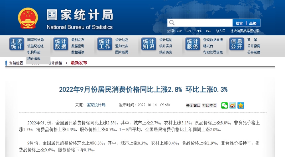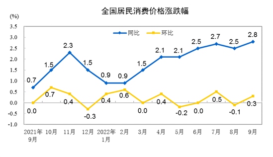 國家統(tǒng)計(jì)局:9月份居民消費(fèi)價(jià)格同比上漲2.8%