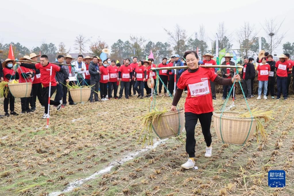 11月15日,在德清縣舉辦的美好家園運(yùn)動(dòng)會(huì)暨新安鎮(zhèn)稻田爭霸賽上,村民參加挑稻谷接力賽。新華社發(fā)(姚海翔 攝)