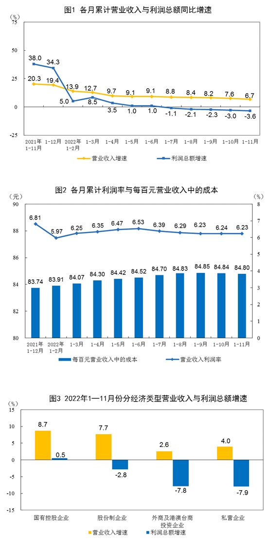 工業(yè)企業(yè)營(yíng)收保持增長(zhǎng),利潤(rùn)有所下降。1—11月份,全國(guó)規(guī)模以上工業(yè)企業(yè)營(yíng)業(yè)收入同比增長(zhǎng)6.7%,企業(yè)銷售總體保持穩(wěn)定增長(zhǎng)。受疫情反彈和需求不足等因素影響,工業(yè)企業(yè)利潤(rùn)同比下降3.6%,降幅較1—10月份擴(kuò)大0.6個(gè)百分點(diǎn)。個(gè)別行業(yè)及少數(shù)重點(diǎn)企業(yè)對(duì)工業(yè)企業(yè)利潤(rùn)下拉影響較大。其中,鋼鐵、石油加工行業(yè)利潤(rùn)同比降幅較大,兩家疫苗重點(diǎn)企業(yè)由于利潤(rùn)同期基數(shù)較高,利潤(rùn)同比大幅減少。剔除上述行業(yè)及企業(yè),其他規(guī)上工業(yè)企業(yè)利潤(rùn)同比增長(zhǎng)6.6%。