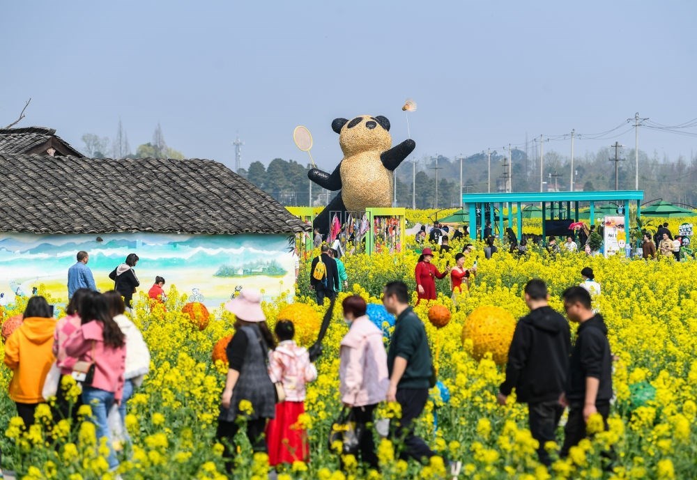 3月5日,在四川省崇州市道明鎮(zhèn),游客在油菜花田中觀光。新華社記者 王曦 攝