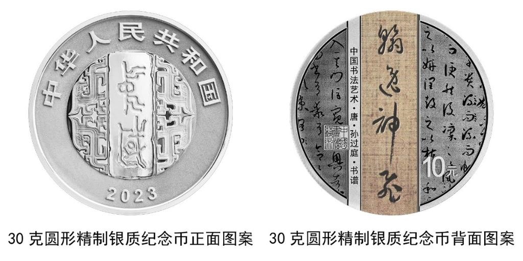 30克圓形銀質(zhì)紀(jì)念幣背面圖案為唐代張旭書《古詩四帖》局部文字及“賢哲”字樣與“中國書法藝術(shù)”篆刻鈐印等組合設(shè)計,并刊“中國書法藝術(shù)·唐·張旭·古詩四帖”字樣及面額。