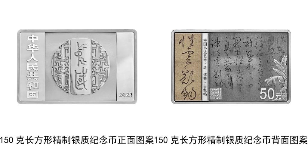 150克長方形銀質(zhì)紀(jì)念幣背面圖案為唐代懷素書《自敘帖》局部文字及“性靈豁暢”字樣與芭蕉、石頭、“中國書法藝術(shù)”篆刻鈐印等組合設(shè)計,并刊“中國書法藝術(shù)·唐·懷素·自敘帖”字樣及面額。