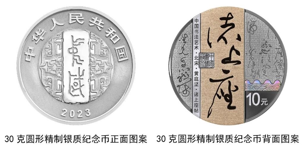 30克圓形銀質(zhì)紀(jì)念幣背面圖案為北宋黃庭堅書《諸上座帖》局部文字及“諸上座”字樣與筆架、“中國書法藝術(shù)”篆刻鈐印等組合設(shè)計,并刊“中國書法藝術(shù)·北宋·黃庭堅·諸上座帖”字樣及面額。