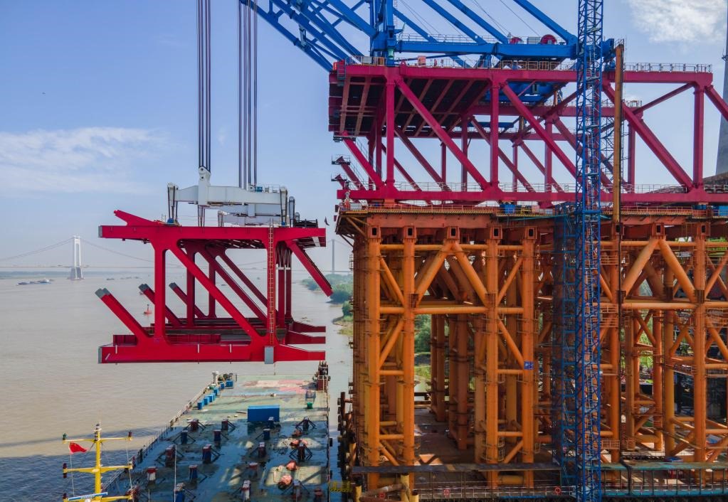 5月28日,馬鞍山長江公鐵大橋正在進(jìn)行主汊航道橋南側(cè)首節(jié)段鋼桁梁吊裝(無人機照片)。新華社發(fā)(羅繼勝 攝)