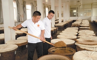 一旁,28歲的學(xué)徒李君正把缸里的醋醅翻到另一個(gè)醋缸之中。這是為了降溫而進(jìn)行的“打平翻缸”操作,要持續(xù)15天時(shí)間?!八螏煾嫡f,發(fā)酵環(huán)節(jié)最難掌握的就是溫度的控制和時(shí)機(jī)?!币郧胺N地為生的李君,已經(jīng)跟著宋俊鵬學(xué)了5年釀醋,一個(gè)月有將近4000元的收入,“學(xué)會獨(dú)門技藝,咱也是手藝人了!”