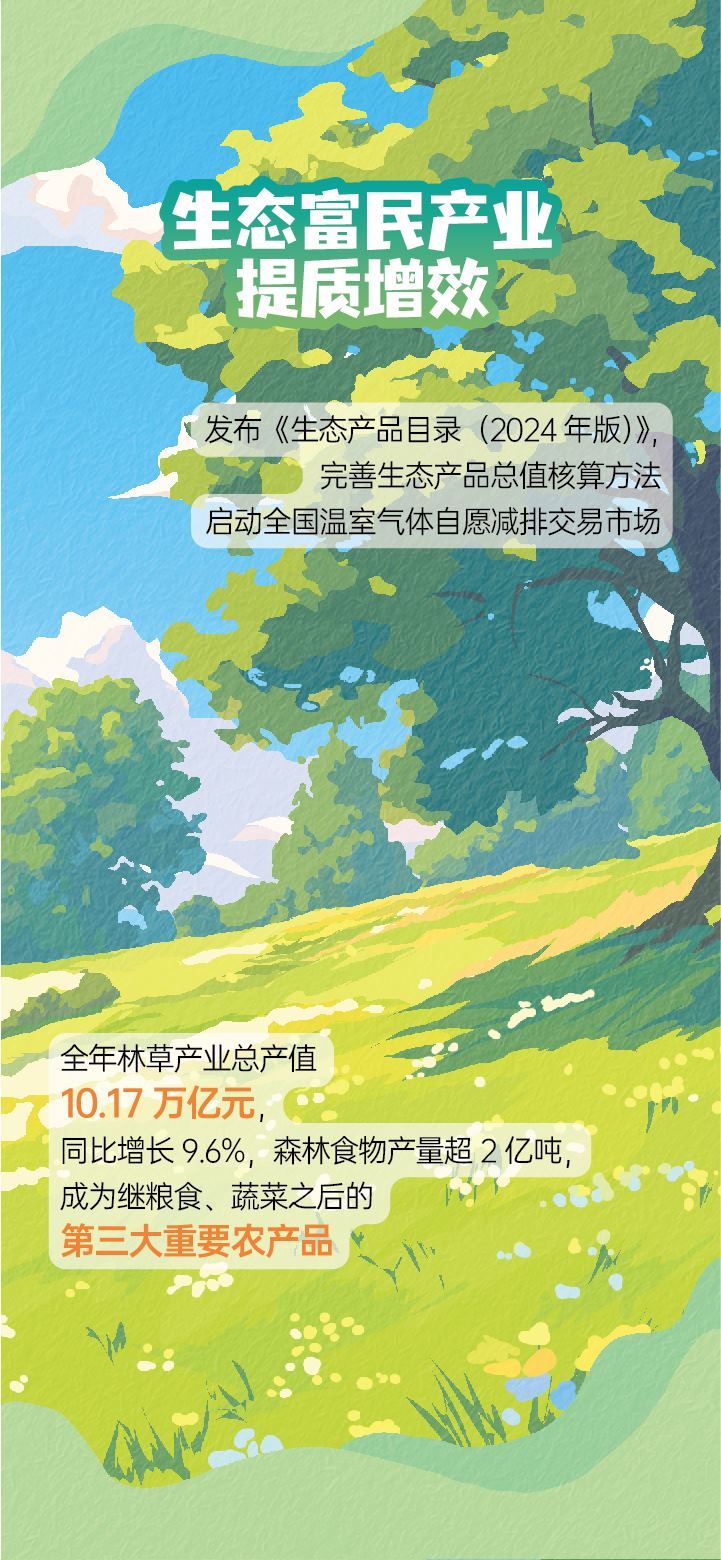 “我們持續(xù)深化改革,推進生態(tài)富民產(chǎn)業(yè)提質(zhì)增效。”張利明說,全年林草產(chǎn)業(yè)總產(chǎn)值10.17萬億元,同比增長9.6%,森林食物產(chǎn)量超2億噸,成為繼糧食、蔬菜之后的第三大重要農(nóng)產(chǎn)品。