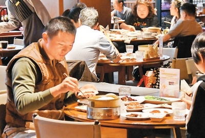 顧客在全聚德烤鴨北京和平門(mén)總店品嘗掛爐烤鴨。