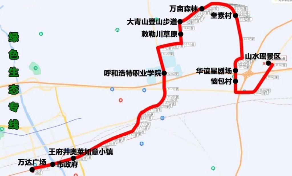 綠色生態(tài)專線(萬達(dá)廣場——山水瑤景區(qū))途經(jīng):新華東街、機(jī)場路、S101、呼和塔拉東街、野馬圖路、Y371、惱包路、110國道、S105省道。沿途設(shè)站:萬達(dá)廣場、市政府、王府井奧萊如意小鎮(zhèn)、呼和浩特職業(yè)學(xué)院、敕勒川草原、大青山登山步道、萬畝森林、奎素村、華誼星劇場、惱包村、山水謠景區(qū),單程:33公里,配車:8—10臺。