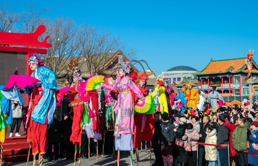 2024年2月15日,民間藝人在呼和浩特新春文化廟會(huì)現(xiàn)場(chǎng)進(jìn)行踩高蹺表演。丁根厚 攝